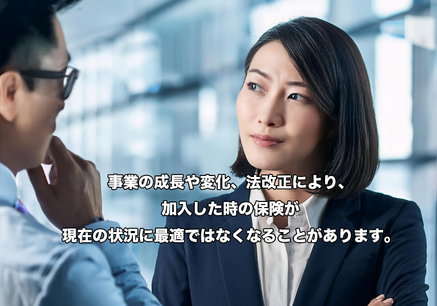 事業の成長や変化、法改正により、加入した時の保険が現在の状況に最適ではなくなることがあります。