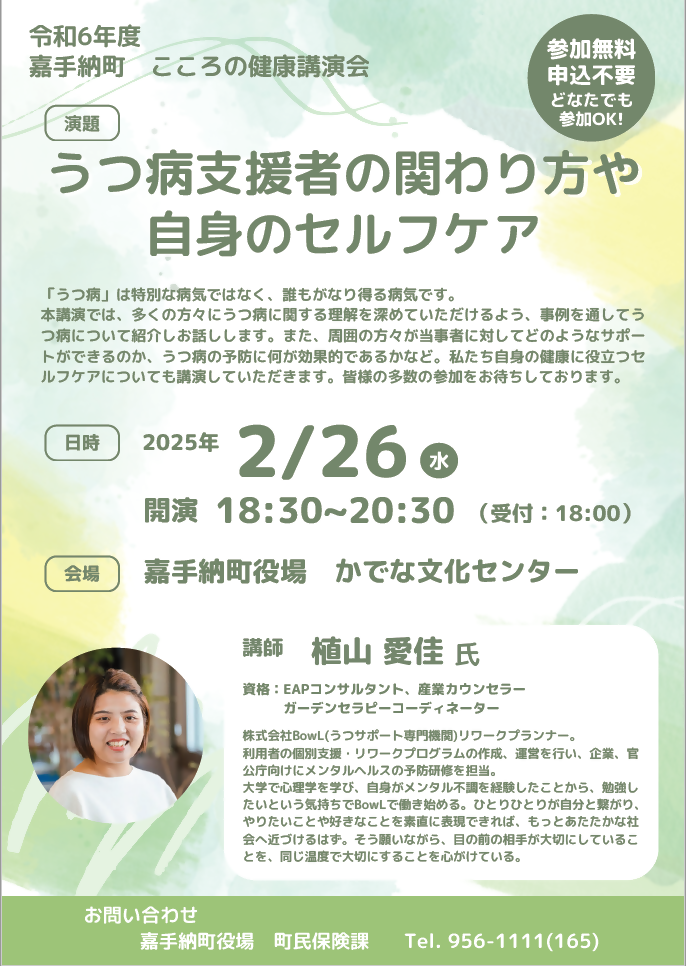 嘉手納町では、自殺対策として植山愛佳氏を招き、うつ病の理解・予防・支援・セルフケアについて講演を行います。