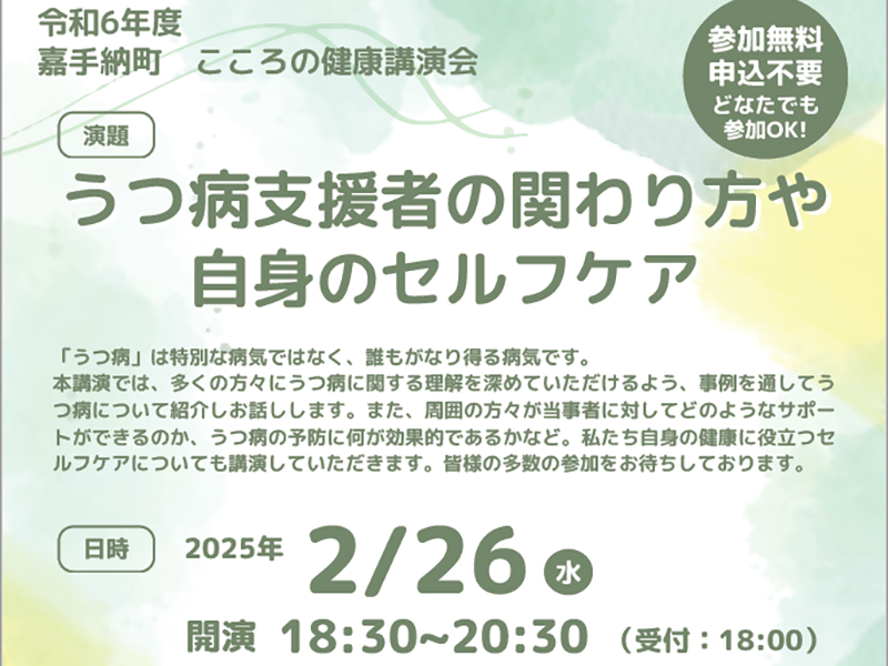 周囲の方々が当事者に対してどのようなサポートができるのか、うつ病の予防に何が効果的であるかなど。私たち自身の健康に役立つセルフケアについてもお話します。皆様の多数の参加をお待ちしております。